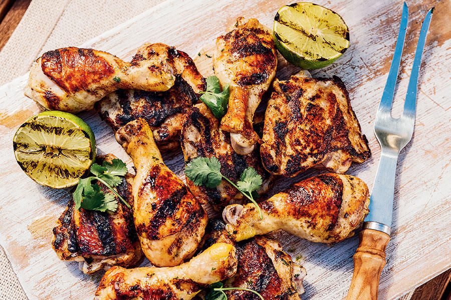 Remove chicken from marinade; discard marinade. Sprinkle with remaining salt. Place on greased grill over medium-high heat; close lid and grill, turning occasionally, until instant-read thermometer inserted in thickest part reads 165°F, about 35 minutes.